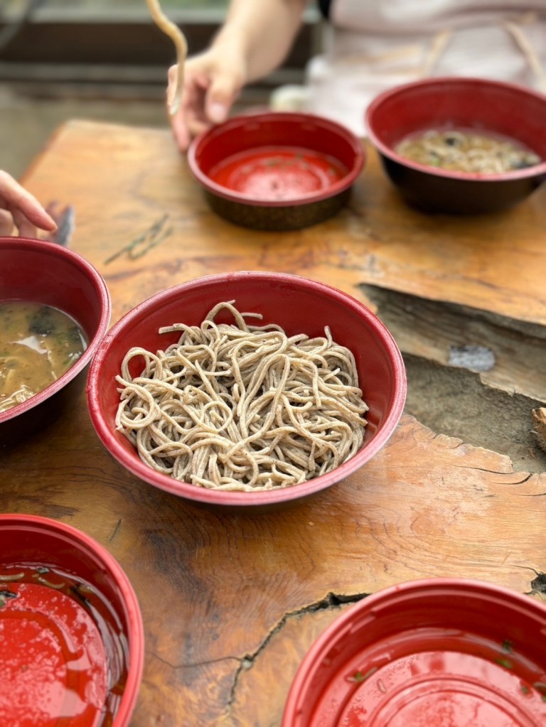そして、楽しかったのが、次に蕎麦打ちを教えてくださった15年選手の先生方が自分たちで打ったものもどうぞ、と出してくださったのです。それがもう全然違うの!蕎麦の香り、コシ、生地のきめ細かさ、歯応え、どれも段違いで美味しい。